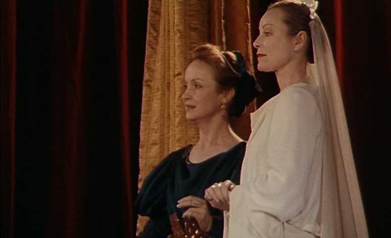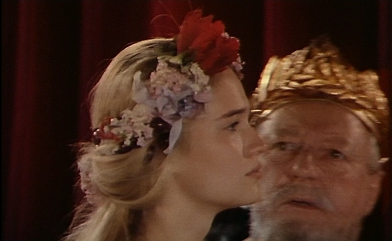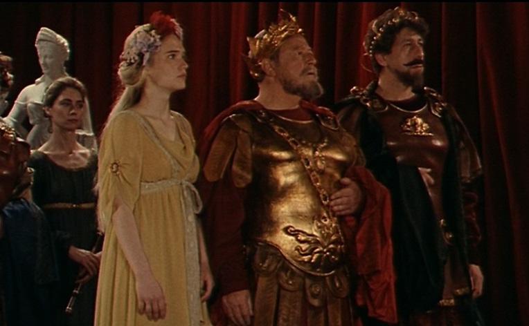 Le cinéma permet également de monter cette scène comme un dialogue, par l’utilisation des champs/contrechamps, entre deux groupes de personnages : d’un côté Léonte, Polixène, Florizel, Perdita, la joueuse de flûte, et de l’autre côté Paulina et Hermione.