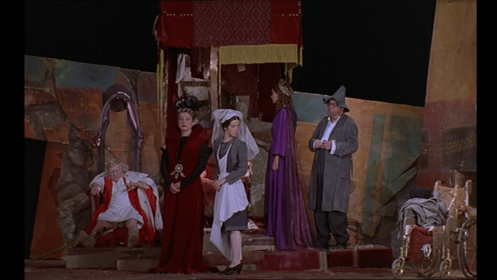 Mais Oliveira nous donnera ensuite accès aux coulisses, en superposant une intrigue muette à l’action de la pièce : cette fois, avec un semblant de communication entre les personnages en coulisses et ceux présents sur la scène, ce qui n’était pas le cas pour Le Roi se meurt.