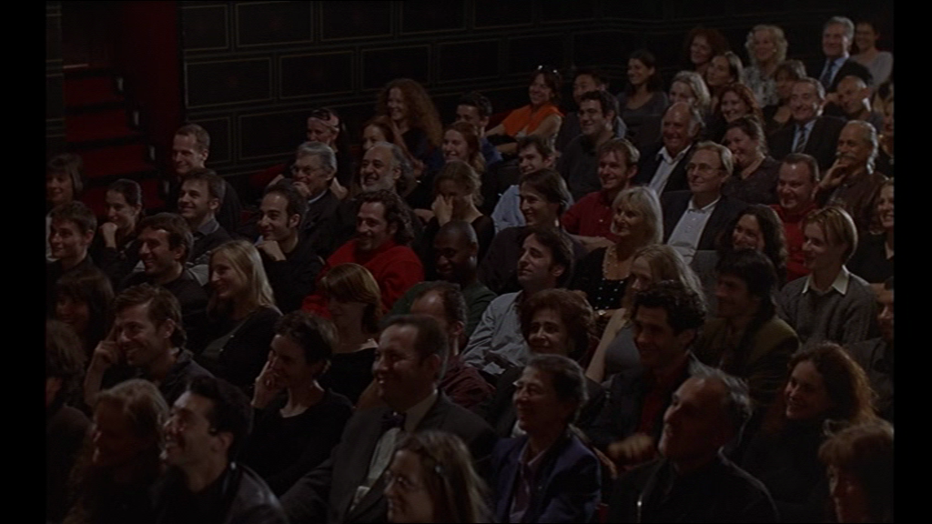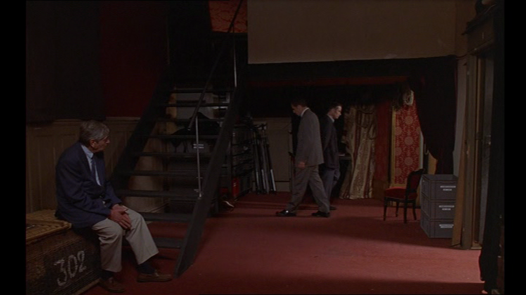 14 Pour tenter de décrypter l’utilisation qui est faite du théâtre au cinéma dans ce film, je propose de me tourner vers Patrice Pavis, qui a rédigé, en introduction d’un catalogue intitulé Théâtres au cinéma, un texte qui fait l’inventaire des différentes techniques d’adaptation de théâtre au cinéma. Il y évoque notamment le théâtre filmé, « terme péjoratif », forme de régression vers « une simple photographie visuelle et sonore », une mise en « conserve » du théâtre (selon l’expression de Guitry) qui privilégie « les longs plans immobiles, évite le champ/contre-champ [...] en sacrifiant à la citation ou à la présence ironique de l’auteur » [7]. La première image du film n’offre pas, a contrario, la vision de la scène, mais de la coulisse, comme un avertissement : nous verrons les ficelles, nous verrons l’envers du décor. Ce n’est pas du théâtre filmé.