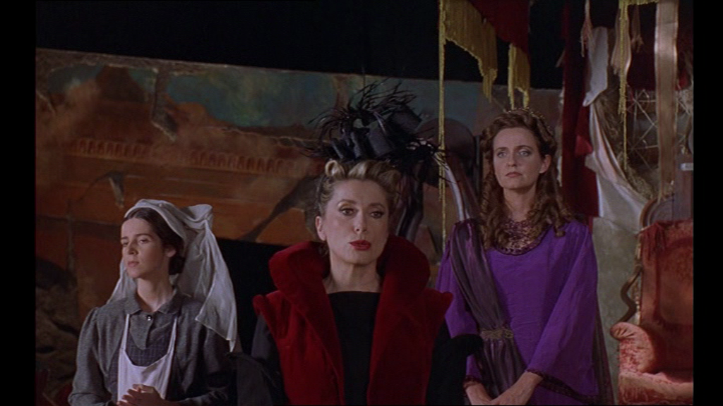 20 Nous avons donc affaire à un captage très cinématographique du théâtre, sur un mode ludique. De Oliveira s’amuse de la confusion possible entre Piccoli et son personnage et entre Deneuve et son personnage (car l’actrice n’apparaît que dans la section consacrée à la pièce de Ionesco, on ne la voit plus dans le reste du film). Elle fait, dit le générique de début, une « participation amicale » qui détonne avec l’habitude qu’elle a pu donner au public d’être toujours l’héroïne de ses films. Ce clin d’œil crée encore une confusion amusante car elle apparaît dans le générique de fin comme incarnant « Marguerite », le personnage de la pièce de Ionesco, puisque le véritable nom de son personnage d’actrice dans le film n’est jamais évoqué. Oliveira joue cependant sur le contraste entre personnage et comédien puisque Deneuve est fidèle dans Le Roi se meurt au symbole de froideur qu’on lui attribue souvent, alors qu’elle est en coulisses, au contraire, une figure d’empathie à l’annonce du drame qui touche Gilbert Valence.
