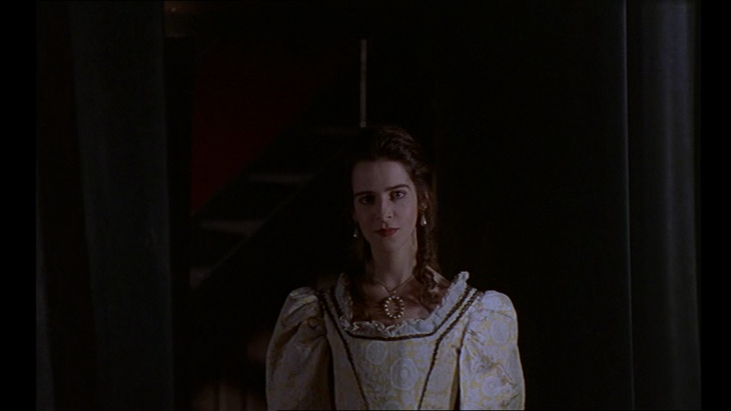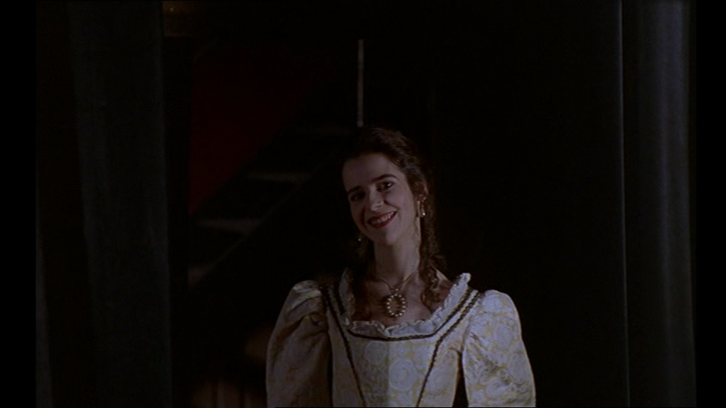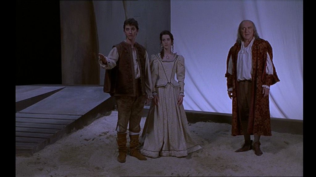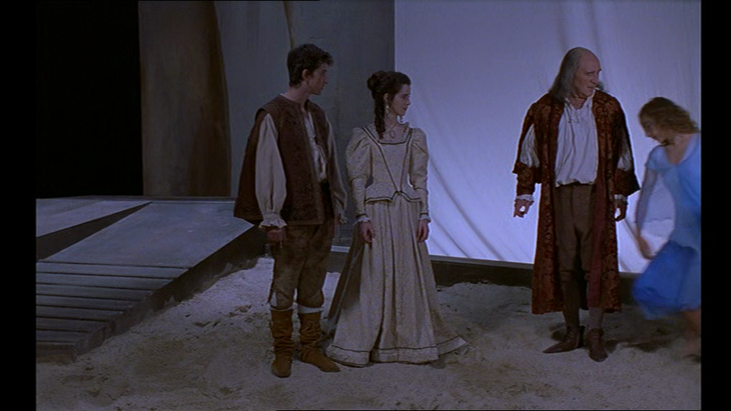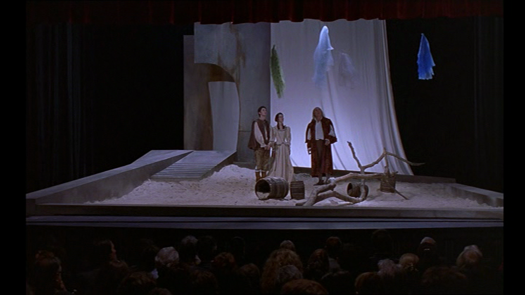 29 D’abord, le trouble de Prospero est feint. Ensuite, dans les coulisses, l’agent (porteur de mauvaises nouvelles lors de la première pièce) paraît enjoindre la jeune fille qui interprète Miranda à se faire remarquer par le héros, présent sur scène, faisant incidemment changer la focalisation car nous voyons alors la scène de théâtre à travers ses yeux à elle, de biais. Une intrigue supplémentaire se greffe ainsi, simultanément à la pièce. L’actrice semble vouloir charmer Valence et lui sourit ostensiblement, depuis les coulisses.