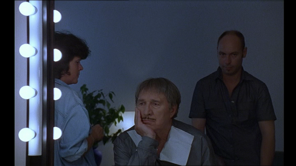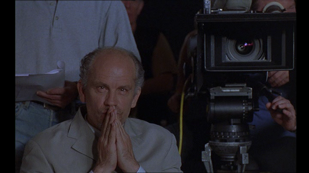 33 À nouveau, le regard est déplacé puisque le metteur en scène devient objet filmique, la caméra se laissant filmer. Nous sommes témoins des moindres réactions de John Malkovich, qui interprète le réalisateur, et qui essaie avec bienveillance de reprendre Valence qui ne parvient pas à dire son texte :
