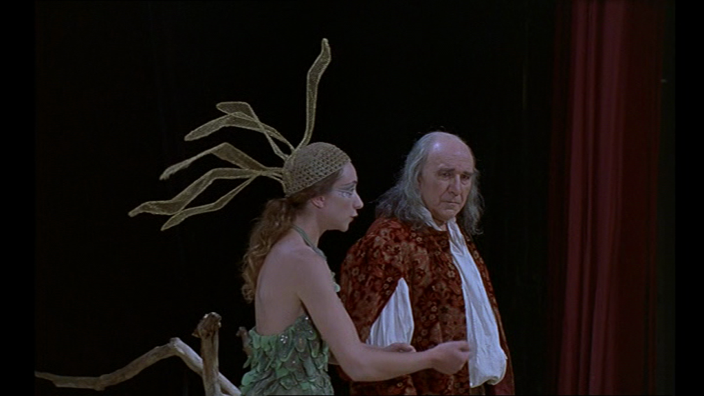 24 Il ne faut peut-être pas négliger le fait que Prospero dit aussi, d’une certaine manière, à la fin de La Tempête, « je rentre à la maison », lorsqu’il demande au public d’être libéré par les applaudissements et renvoyé à Naples. Ce jeu porte à l’évidence sur le métadramatique « nous sommes faits de la même étoffe que les rêves… ». En nous proposant la scène du « Masque », Oliveira offre une mise en abyme de plus : un spectacle dans la pièce dans le film ― d’autant que le Masque a une fonction proche de celle des pièces dans le film. Il constitue une pause poétique dans l’intrigue principale, il diffère l’action, avant que Prospero ne se ressaisisse : « J’oubliais l’odieux complot tramé par Caliban, le monstre, et ses complices, contre ma vie. L’heure de la machination est venue. Beau travail. Partez maintenant. C’est fini » [13].