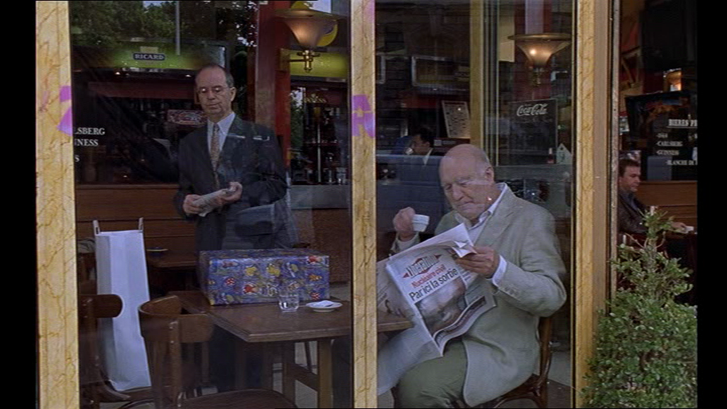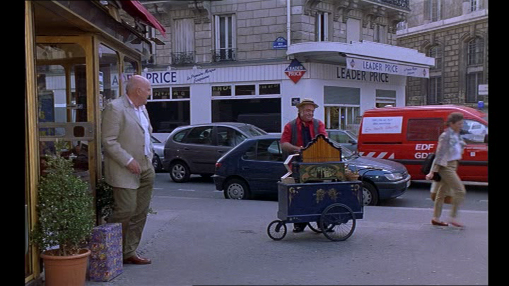 10 Une scène burlesque et quasi-muette montre une routine bouleversée. En effet, à plusieurs reprises, avant ce moment du film, le spectateur est témoin d’un rituel involontaire entre deux hommes. Le personnage de Michel Piccoli prend son café en lisant Libération ; son café fini, il se lève, et quelques secondes après, un autre homme s’installe à la même place, commande un café et ouvre Le Figaro. La scène est filmée derrière une vitre et seul le trafic bruyant du boulevard voisin se fait entendre. Ce rituel est une machine bien huilée qui va pourtant se détraquer. L’orgue de barbarie (qui ne sonne cependant bien que si l’on tourne la manivelle en rythme) met en musique cette scène de petite mécanique quotidienne qui déraille.