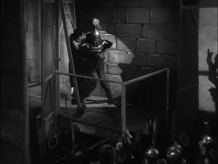 23 Although primarily pertaining to the film’s phenomena of specularity, [53] that Léonard, Bertal’s understudy as Banquo, should look like his double, played by the very same Michel Simon, is a remarkably bright idea. Since Bertal was shot while in costume and make-up, the mirror effect between the two men is all the more stunning, and all the characters (actors as much as police officers) are struck by the resemblance. Thus whenever Macbeth faces Banquo in the play, Ludovic finds himself gazing upon what looks to him like his own victim’s phantom (Bertal) in the person of his double (Léonard). To cap it all off, in the banquet scene (III.4), Ludovic sets his eyes on Banquo’s ghost, himself Bertal’s specter, so that, staring at the ghost of a ghost, Ludovic eventually falls apart. This trick enhances a visual resurgence from the backstage area (Bertal) over to the stage boards (Léonard/Banquo).