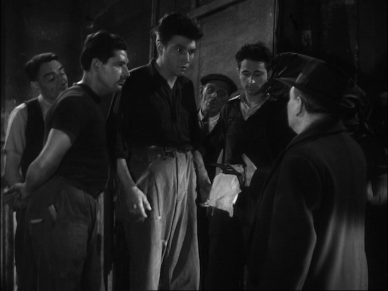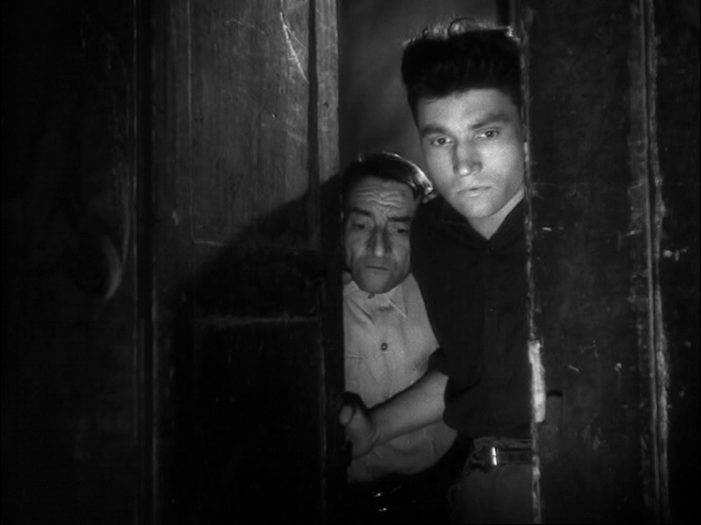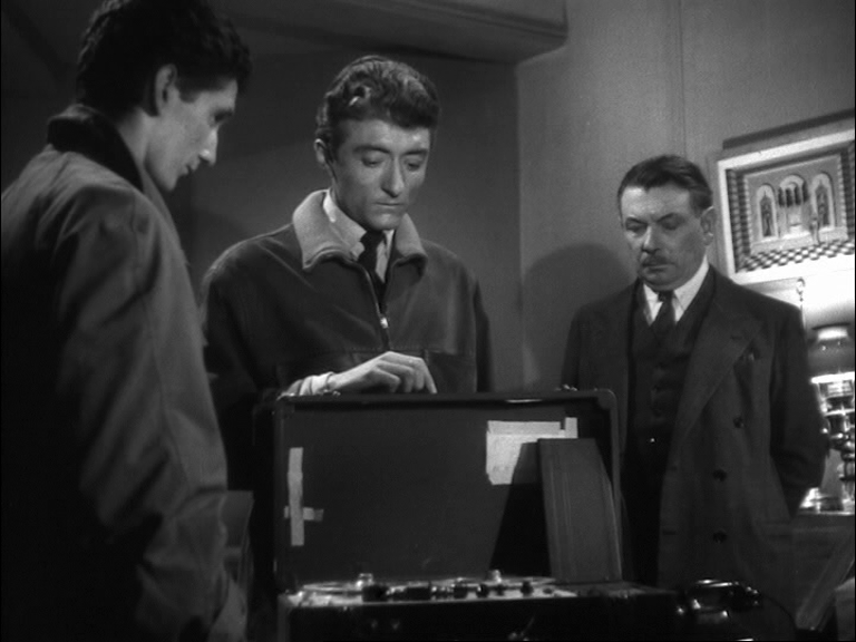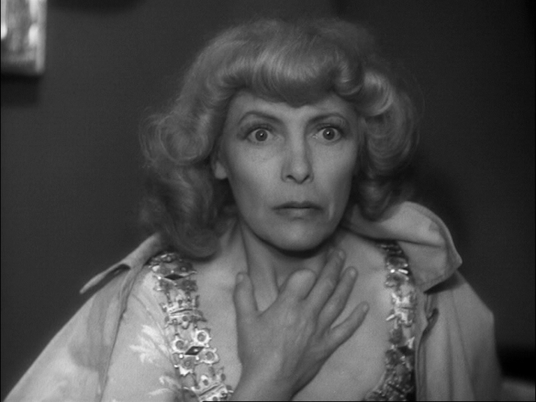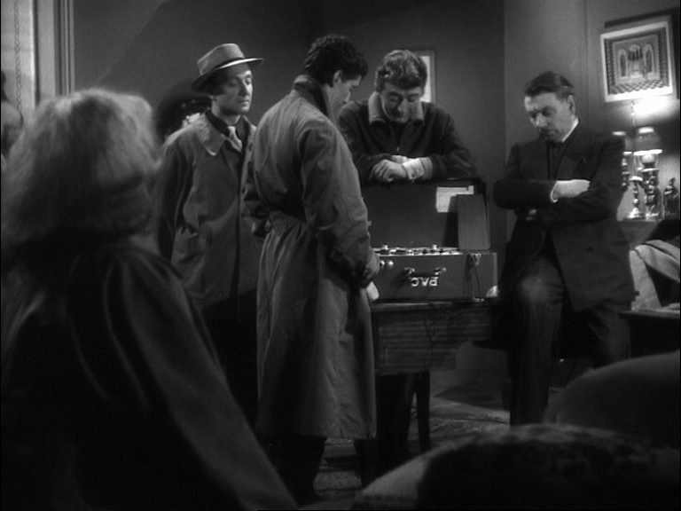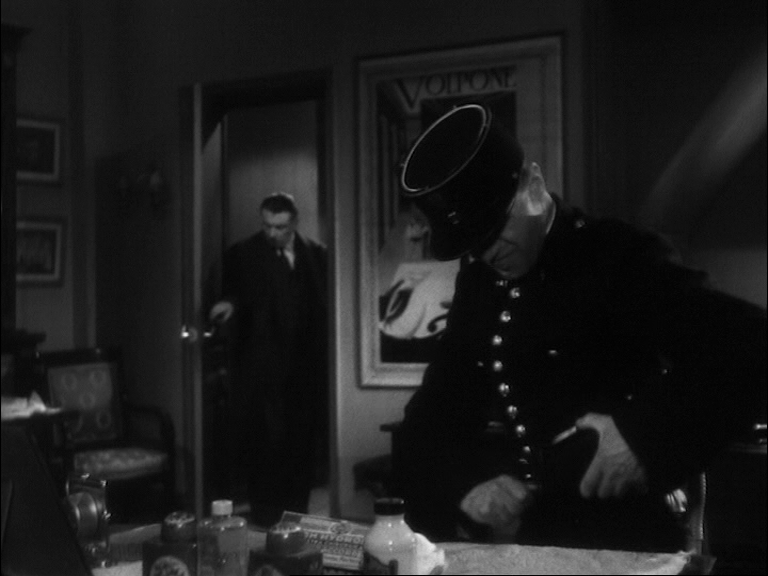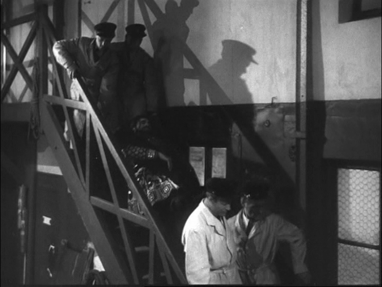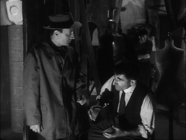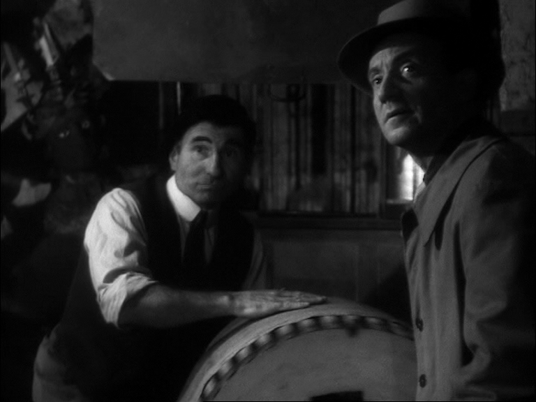 10 Dans le premier exemple (time code 40.32 – 41-45), est visualisée la rencontre entre Duncan et Lady Macbeth, qui l’accueille avec une révérence appuyée : « Voici notre hôtesse honorée. L’amour qui nous pourchasse est souvent un tourment et pourtant nous le bénissons au fond de nos cœurs parce qu’il est l’amour. Ainsi ma présence dans votre demeure est à la fois un acte d’amour et un ennui pour vous... » [9]. Lady Macbeth a tout juste le temps de lui accorder une nouvelle révérence qu’un changement de plan révèle les machinistes dans les combles. Ces derniers amènent presque de force devant l’inspecteur en chef (Jean Brochard) le collègue qui a assisté à l’altercation entre Bertal et Sigurd. Celui-ci n’osait pas se manifester. On entend vaguement les paroles de la représentation qui s’inscrivent en pointillés : « ... Sir de Cawdor... ». Le jeune homme confie que Sigurd n'est pas un mauvais bougre mais qu’il lui a montré l’après-midi même un « pétard » rouillé qu’il avait dû acheter aux puces. L’officier lui présente une arme enveloppée dans un mouchoir et lui demande s’il s’agit de celle-ci pendant que Duncan poursuit sa tirade fragmentée : « ... belle et noble hôtesse... » [10]. L’homme reconnaît le revolver. Les paroles de Lady Macbeth semblent sourdre : « ... plaisir de votre altesse afin de lui restituer ce qui lui appartient... / Duncan : Donnez-moi votre main... » [11]. Cet exemple est une excellente illustration du clair-obscur dans toutes ses nuances.