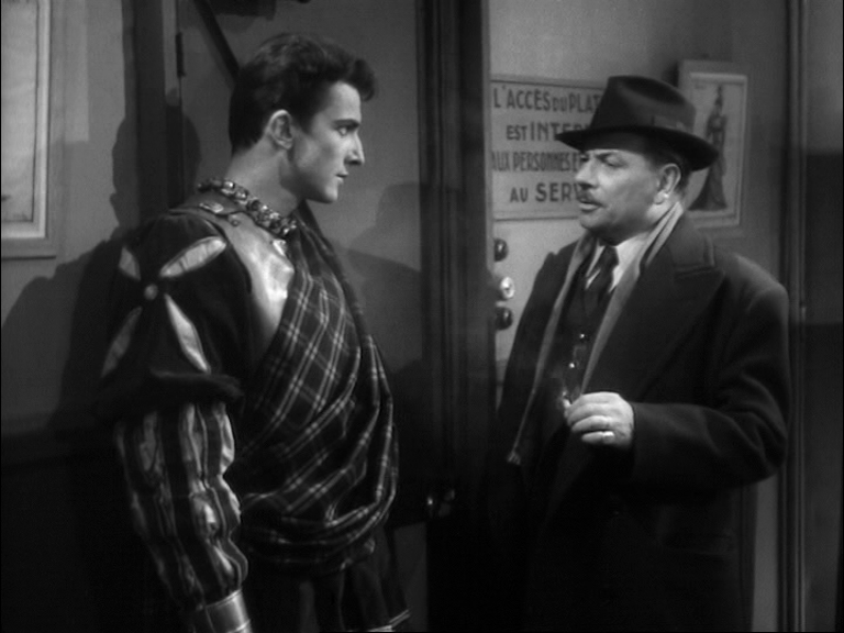 1 Le Rideau rouge, réalisé par André Barsacq en 1952, d’après un scénario écrit en collaboration avec Jean Anouilh, explore la thématique combien fascinante de la mise en abyme. L’intrigue porte sur une troupe d’acteurs parisiens mettant en scène la tragédie shakespearienne, Macbeth. Si ce type d’insertion n’est pas rare sur les écrans [2], Le Rideau rouge soumet à une investigation sans précédent les arcanes métadramatiques/métafilmiques non pas précisément de la pièce dans la pièce ou du film dans le film mais ici de la pièce (filmée) dans le film. Ce faisant, le réalisateur œuvre avec une grande ingéniosité à prospecter les phénomènes de perméabilité entre les deux fictions. La technique adoptée par Barsacq est fascinante, complexe, subtile mais aussi protéiforme. L’élément métadramatique/métafilmique (la pièce [en l’occurrence filmée] dans le film) aurait pu s’insérer de façon autonome et parfaitement hermétique dans l’élément premier. Alternativement, on aurait pu aussi assister à des fragments perlés de la pièce à différents moments avec retour dans les intervalles au niveau un de l’intrigue (pratique du montage alterné). Les deux éléments seraient alors restés parfaitement cloisonnés, se répondant seulement par un jeu d’échos structurels. Barsacq va beaucoup plus loin en les fusionnant à maintes reprises ; il fait rejaillir le « texte » intradiégétique (au sens large de « texte » [3]) sur le texte premier si bien qu’il semble littéralement sourdre, remonter des abîmes/abymes intradiégétiques et imprégner le texte un. Ce sont des phénomènes visuels, voire simultanément visuels et acoustiques. Néanmoins, étant donné le foisonnement de procédés par lesquels le réalisateur fait communiquer les deux fictions, j’ai choisi de ne prospecter ici que les jeux purement acoustiques, qui me semblent hors du commun. Par ce reflux, l’œuvre en abyme va venir investir et infléchir le cours de l’œuvre qui l’encadre, et celle-ci va finir à son tour par interférer avec la fiction théâtrale interne.