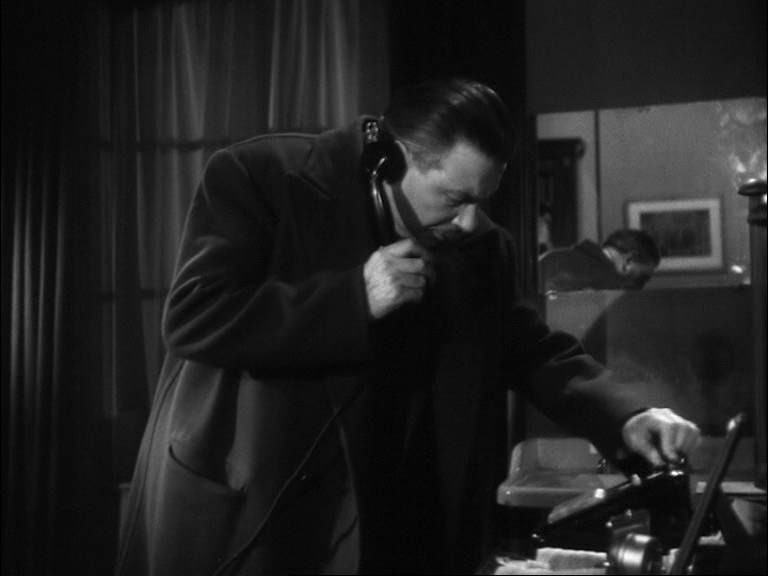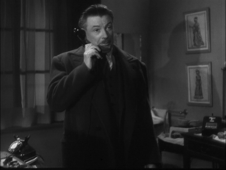18 Après la stichomythie par laquelle il fait dialoguer tour à tour l’un et l’autre textes, Barsacq va encore poursuivre avec une audace grandissante son exploration des manifestations sonores en superposant tout à fait les deux textes cette fois dans une totale cacophonie (time code 36.15 – 37.42). L’inspecteur en chef est au téléphone en communication avec son supérieur. Il se trouve dans la loge de Bertal, dont le cadavre gît encore sur le sol. Il promet que l’assassin sera arrêté d’ici le matin.
