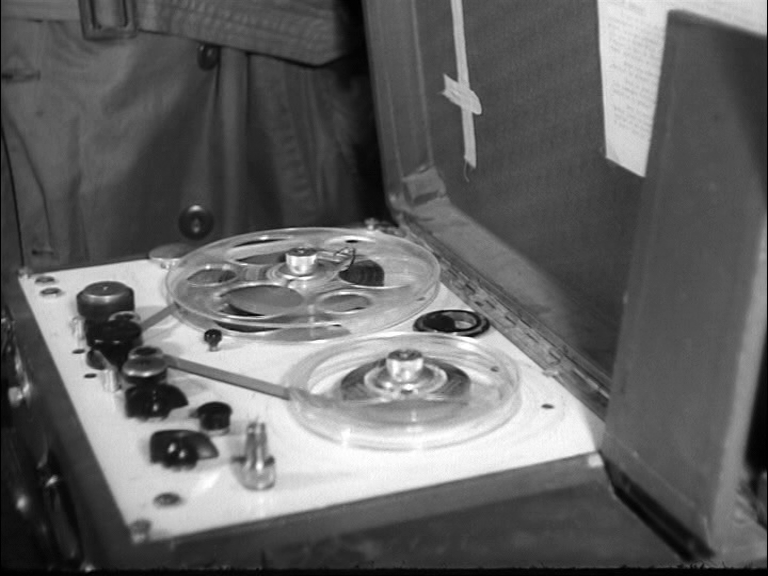 23 Quelque temps plus tard, l’inspecteur regagne la loge, suivi d’Aurélia et de son adjoint. Quand deux journalistes lui disent vouloir récupérer le magnétophone sur lequel Bertal a enregistré son interview, il commence par les renvoyer sans ménagement puis il revient sur ses pas et veut savoir comment fonctionne l’appareil. Il demande à entendre la bande depuis le moment où les journalistes ont laissé Bertal seul (time codes 1.12.11 – 1.14.23). On entend à nouveau pendant que la caméra cadre Aurélia : « Macbett, c’est l’histoire sordide d’un crime et c’est tout ». La bande poursuit alors que la caméra revient tantôt sur les hommes tantôt sur Aurélia :