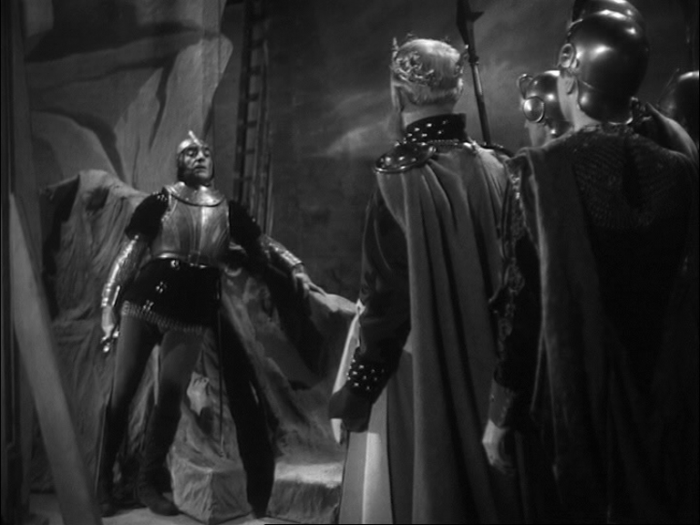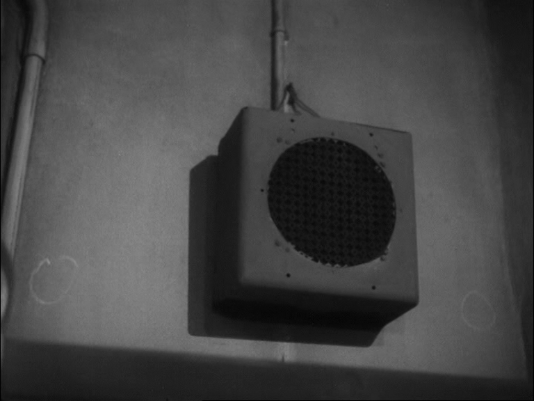 13 Barsacq continue d’explorer le découplage du visuel et du sonore et met en œuvre une nouvelle stratégie tout à fait ingénieuse quant à elle autant qu’audacieuse dans une autre séquence. Un soldat blessé arrive sur scène, le capitaine de la deuxième scène de la pièce de Shakespeare ; le roi vient à sa rencontre et s’enquiert avec autoritarisme : « Qui est cet homme ensanglanté ? Il doit pouvoir, à en juger par l’état où il se trouve... ». À cet instant, un changement brutal de plan se focalise sur un haut-parleur fixé en hauteur à un mur, par lequel on continue d’entendre le roi : « ... nous donner des nouvelles de la révolte » [13].